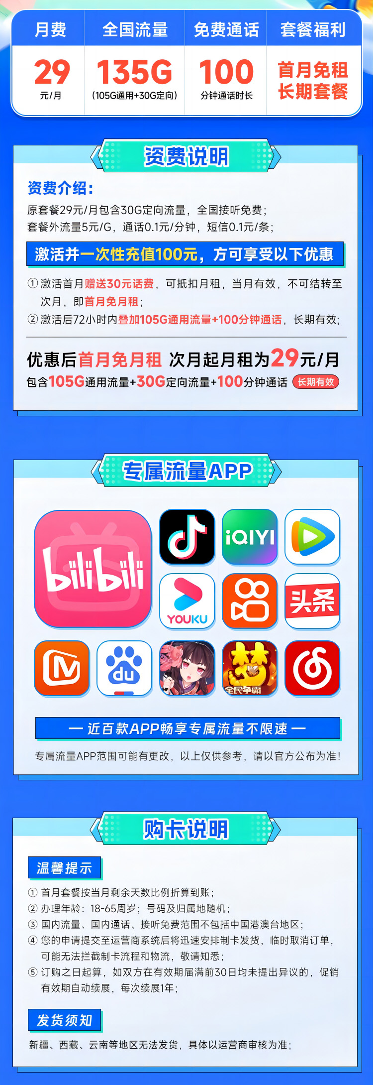 【全能王】光速卡29元长期135G+100分钟,首月0月租
