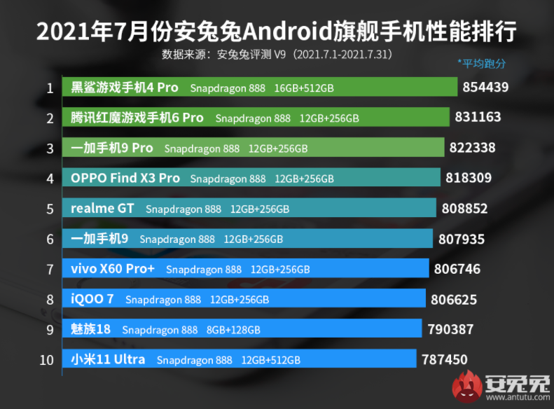 近日,国内知名“娱乐”跑分软件安兔兔公布了2021年7月Android旗舰手机性能排名,与之前几个月一样,依然是骁龙888机型霸榜,华为麒麟9000名落孙山,这似乎已经没有了什么悬念,不过相比上个月排名,7月的榜单有了些许变化。